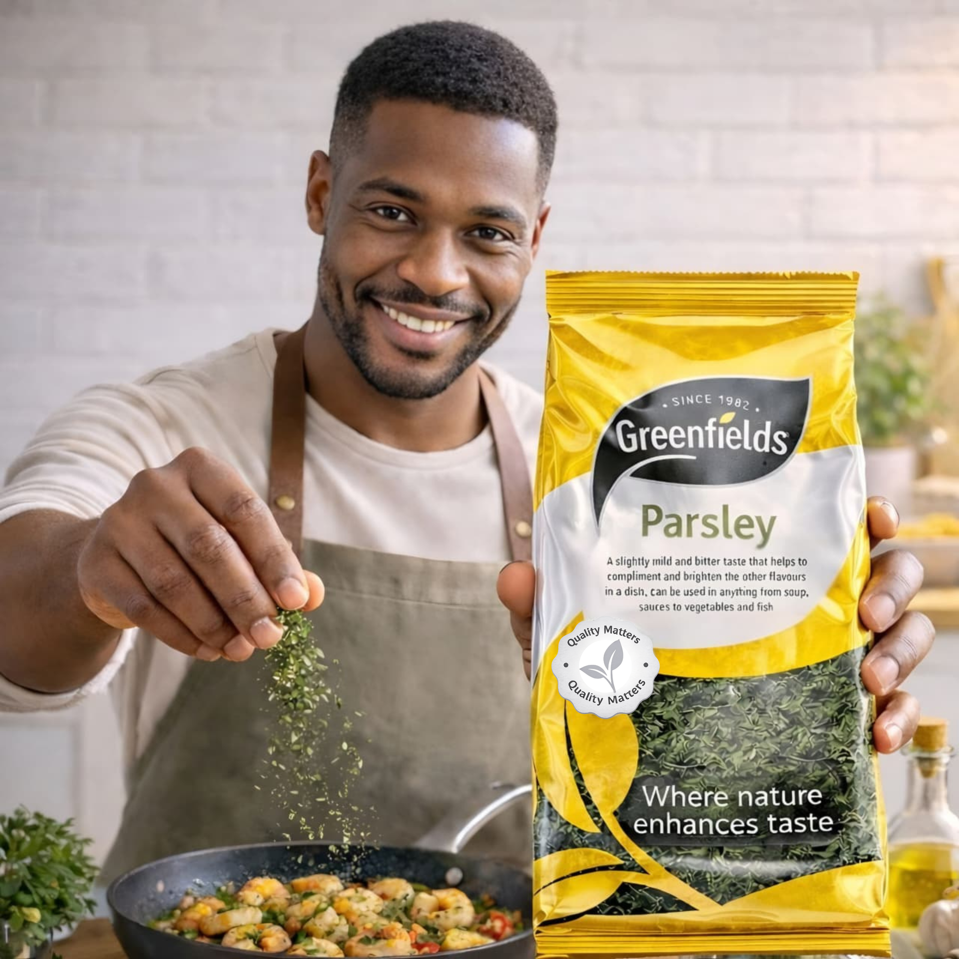 Experience the fresh, vibrant essence of Greenfields Flat Leaf Parsley. Its slightly mild, bitter notes expertly brighten and complement flavours in any dish, from soups and sauces to vegetables and fish.